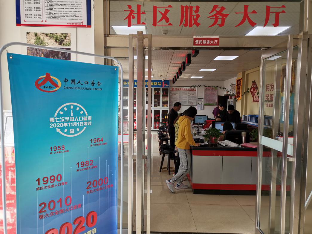 10月13日,九华街道将军渡社区服务大厅外,树立着一幅“中国人口普查”宣传画,大厅内,社区工作人员有的忙着做人口普查数据登记,有的忙着和居民电话沟通核对相关信息。