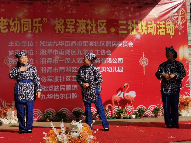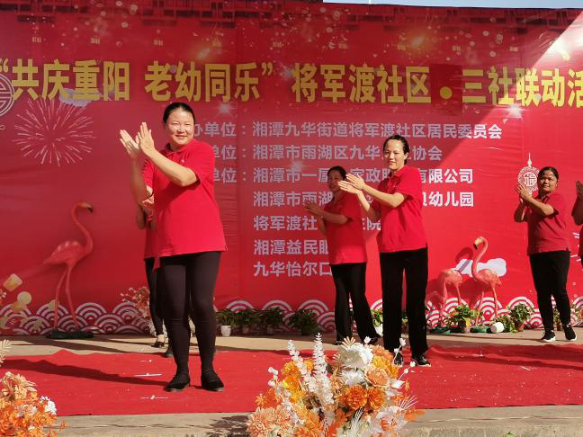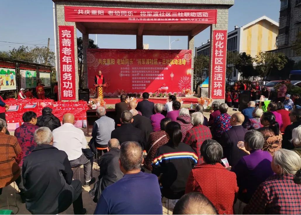 10月23日,在九华街道将军渡社区文化广场舞台的两侧,“完善老年服务功能 优化社区生活环境”的标语引人注目。舞台上载歌载舞,一场三社联动庆重阳的活动在此举行。