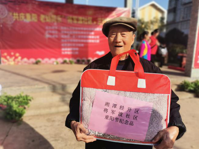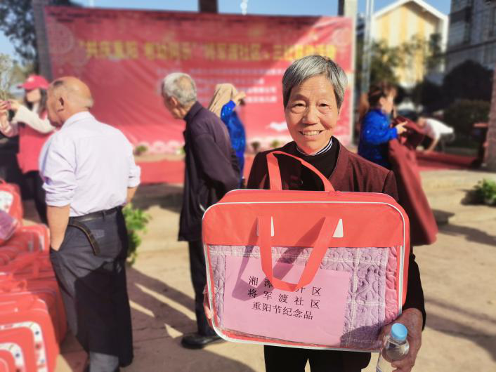 除了丰富多彩的文艺节目,将军渡社区还为辖区内年满70岁的老人送上温暖的重阳节慰问品。家住郭家安置区79岁的唐雪梅和86岁的朱传兴两位老人,在拿到重阳节慰问品后,非常开心。现场共发放礼品148份。
